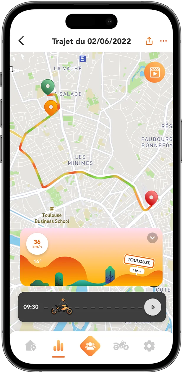 Thanks to the innovative mode of replaying your journey, you can see your avatar driving directly on the map. You can move it at any point during the trip to retrieve your speed or the weather at that time.
